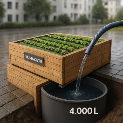 Die Klimakiste nimmt Regenwasser über ihre durchlässige Oberfläche auf und leitet es in einen integrierten Tank mit einem Fassungsvermögen von bis zu 4.000 Litern. In Trockenperioden kann der Tank manuell befüllt werden, was eine kontinuierliche Bewässerung der Pflanzen auch unter extremen Klimabedingungen gewährleistet.
