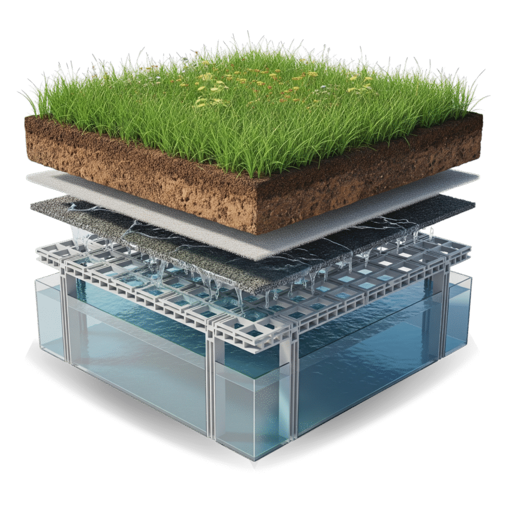 Technische Barriere, die das untere Reservoir schützt und eine kontrollierte Entwässerung und effiziente Trennung zwischen den Schichten des integrierten Systems ermöglicht.